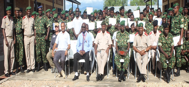 La formation en vue de la préparation du 57,58 et 59è bataillons AMISOM a duré six semaines. Et les cérémonies de clôture ont été rehaussées par le Général de Brigade Venuste Nduwayo chef de service chargé de la formation à la FDNB. Dans son discours de circonstance, le Général de Brigade Vénuste Nduwayo chef de service chargé de la formation à la FDNB a remercié l’UNMAS qui ne cesse de former les militaires burundais dans le but de les rendre professionnels. Il a fait savoir que la formation était axée sur la détection, la neutralisation et la destruction des engins explosifs. Il a souligné que cette formation aura une valeur ajoutée au contingent burundais de l’AMISOM car au départ cette formation se faisait au moment où les troupes sont déjà déployées sur terrain ce qui occasionnait une perte de temps et la vulnérabilité des forces. Venuste Nduwayo a ajouté que cette formation s’est focalisée aussi sur la sensibilisation et la planification des convois. Il a remercié les formateurs qui se sont donné corps et âmes malgré les conditions de travail difficiles. Le Général de Brigade Venuste Nduwayo a recommandé aux stagiaires de s’approprier des connaissances acquises pour faire face aux actions des terroristes Al shabaab qui utilisent le combat asymétrique.