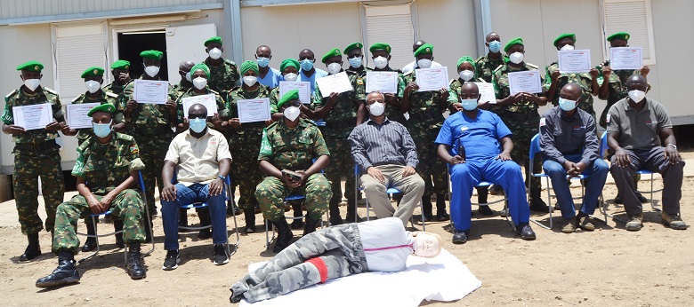 Treize militaires issus du personnel médical du14e Contingent burundais de l’AMISOM ont reçu des certificats après une formation théorique et pratique de cinq jours sur les techniques médicales modernes adaptées au champ de bataille le 29 mars 2022. La formation a été dispensée par l’UNMAS à Jowhar Air Field.