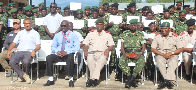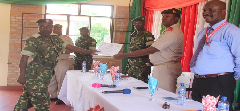 La formation en vue de la préparation du 57,58 et 59è bataillons AMISOM a duré six semaines. Et les cérémonies de clôture ont été rehaussées par le Général de Brigade Venuste Nduwayo chef de service chargé de la formation à la FDNB. Dans son discours de circonstance, le Général de Brigade Vénuste Nduwayo chef de service chargé de la formation à la FDNB a remercié l’UNMAS qui ne cesse de former les militaires burundais dans le but de les rendre professionnels. Il a fait savoir que la formation était axée sur la détection, la neutralisation et la destruction des engins explosifs. Il a souligné que cette formation aura une valeur ajoutée au contingent burundais de l’AMISOM car au départ cette formation se faisait au moment où les troupes sont déjà déployées sur terrain ce qui occasionnait une perte de temps et la vulnérabilité des forces. Venuste Nduwayo a ajouté que cette formation s’est focalisée aussi sur la sensibilisation et la planification des convois. Il a remercié les formateurs qui se sont donné corps et âmes malgré les conditions de travail difficiles. Le Général de Brigade Venuste Nduwayo a recommandé aux stagiaires de s’approprier des connaissances acquises pour faire face aux actions des terroristes Al shabaab qui utilisent le combat asymétrique.