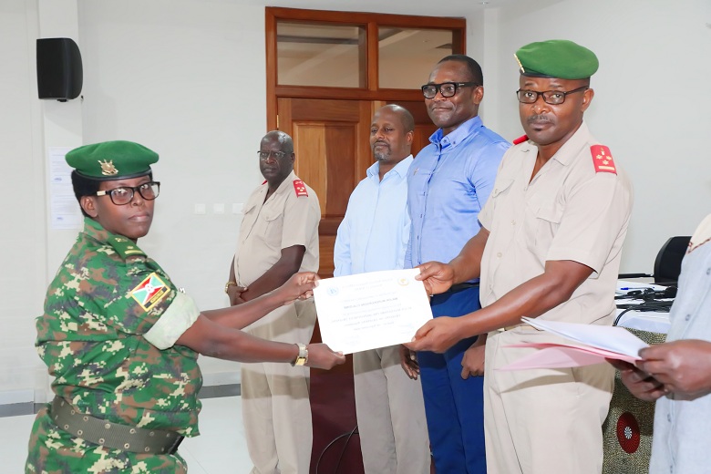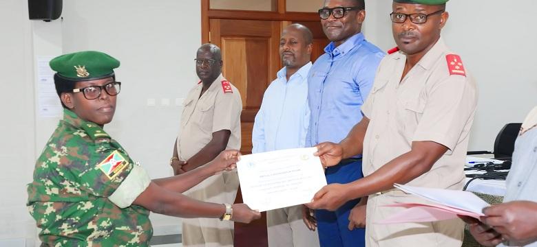 Le Chef de service adjoint chargé de l’instruction, de l’entraînement et des opérations le Colonel Victor Nduwumukiza a, au nom du commandement de la FDNB, indiqué que la formation a permis aux bénéficiaires d’acquérir la méthodologie d’enseignement, la préparation des leçons, l’animation des séances de formation ainsi que des connaissances sur les modules de formation obligatoire au pré-déploiement. Il a profité de cette occasion pour remercier les formateurs mandatés par la commission de l’Union Africaine, la mission ATMIS et l’UNSOS qui n’ont ménagé aucun effort pour la réussite de cette formation. Il a ainsi invité les officiers bénéficiaires de cette formation à approfondir les connaissances acquises par des recherches afin de pouvoir dispenser à leur tour des leçons bien affinées.